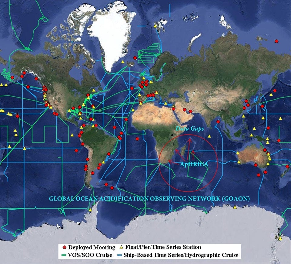 The Global Ocean Acidification Observing Network (GOAON) with approximate locations for ‘ApHRICA’, a pilot project to deploy ocean pH sensors in South Africa, Mozambique, the Seychelles, and Mauritius for the first time. This project is a public-private partnership to fill in gaps for ocean acidification research in East Africa involving the U.S. Department of State, the Ocean Foundation, the Heising-Simons Foundation, Schmidt Marine Technology Partners, and the XPRIZE Foundation and various research institutions.